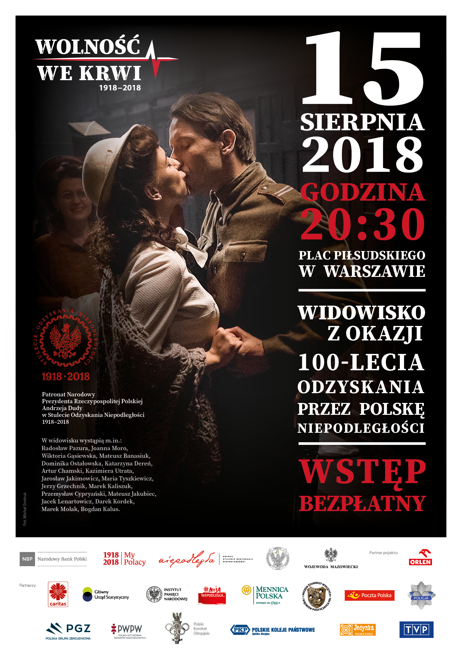 Narodowy Bank Polski uczestniczy w obchodach 100-lecia odzyskania przez Polskę niepodległości. Prowadzony przez bank centralny rocznicowy projekt „My Polacy 1918-2018” honoruje wydarzenia sprzed stu lat emisją wyjątkowych monet i banknotu kolekcjonerskiego. Dodatkowym i niezwykłym uświetnieniem rocznicy odzyskania przez Polskę niepodległości jest widowisko muzyczne Wolność we krwi, na które NBP zaprasza 15 sierpnia br. na plac Piłsudskiego w Warszawie. W scenach fabularyzowanych, w otoczeniu specjalnie stworzonej scenografii wystąpią m.in.: Radosław Pazura, Dominika Ostałowska, Kazimiera Utrata, Joanna Moro, Artur Chamski, Darek Kordek. Spektakl wzbogacą efekty dźwiękowe, projekcje wizualne i znane utwory muzyczne.